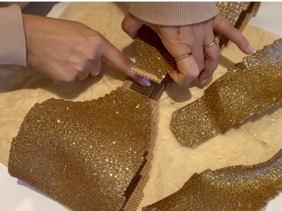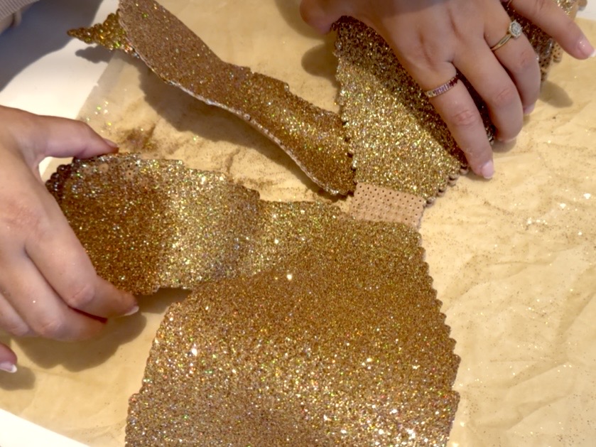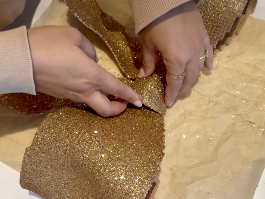 Inden du limer delene sammen kan du med fordel give hvert del hobbylim og glitter, hvis du ønsker din sløjfe skal glimte til sidst.