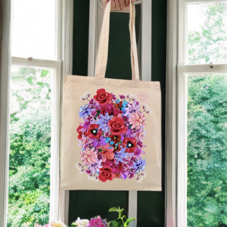 Denne fine mulepose er trykt med mange af de smukke blomster fra ‘PERLEBLOMST‘ bogen.