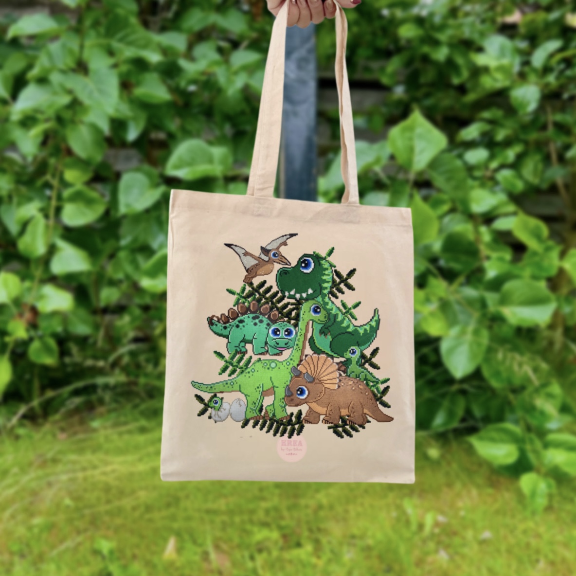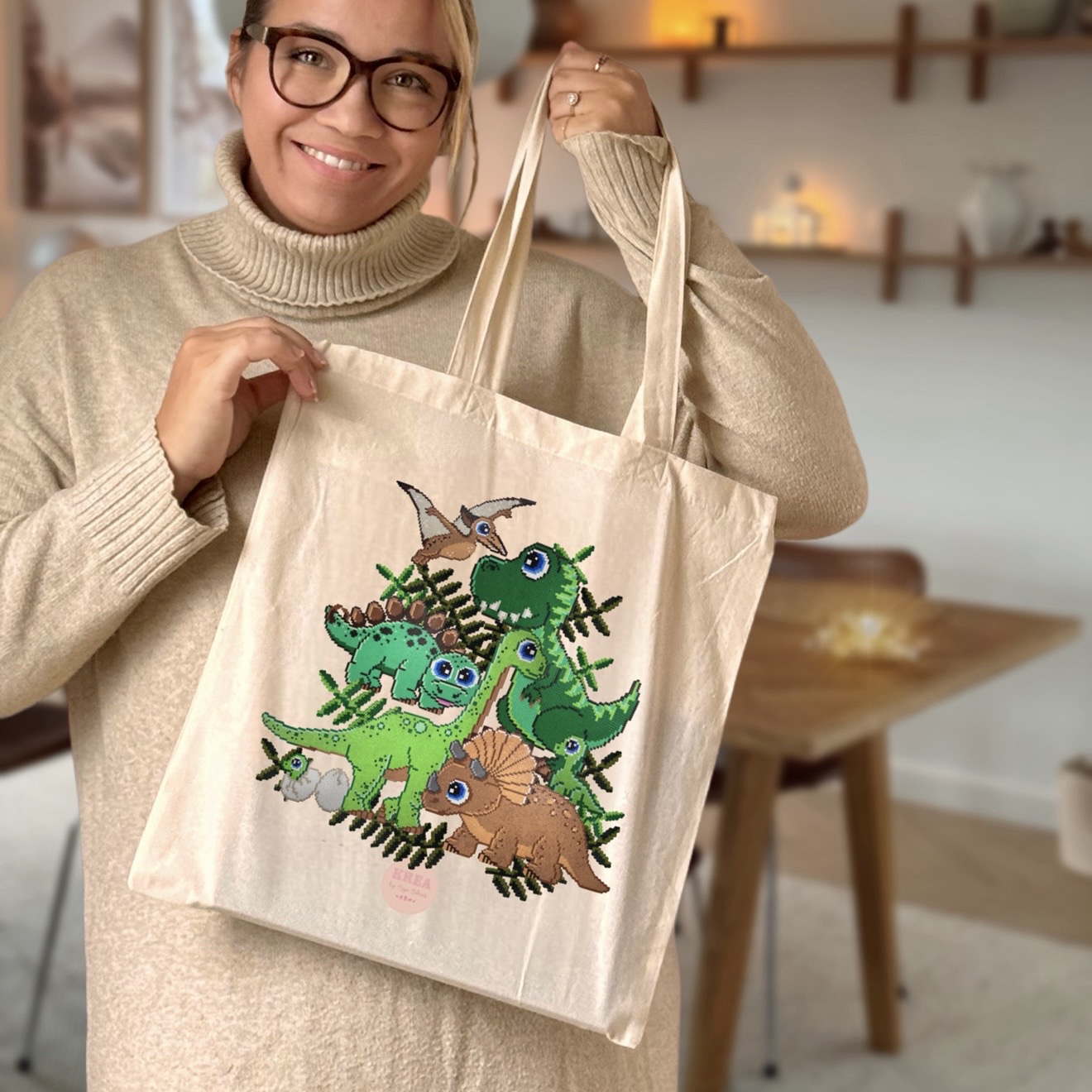 Denne fine mulepose er trykt med mange af de fantastiske dinosauer motiver fra ‘PERLEUNIVERS‘ bogen.